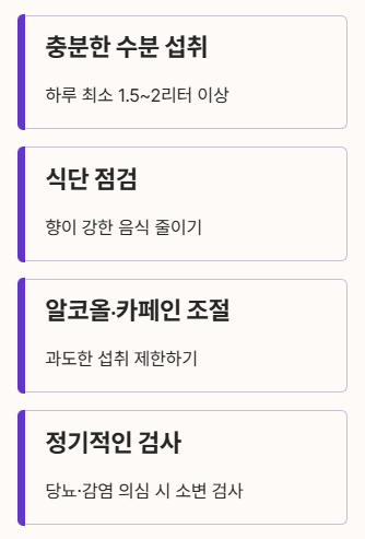 냄새가 심할 때는 아래 생활습관 개선이 도움이 됩니다.