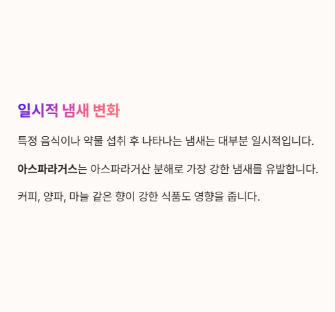 음식이나 약이 원인이라면 일시적으로 냄새가 강해졌다가 사라지는 경우가 많습니다.