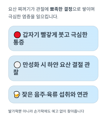 - 증상 체크: 어느 날 갑자기 손가락 마디가 빨갛게 부어오르고 손을 댈 수 없을 정도로 극심한 통증이 발생합니다. 만성이 되면 손가락 마디에 하얀 요산 결절이 튀어나와 눈으로 보이기도 합니다. 잦은 음주나 육류 섭취를 즐긴다면 더욱 의심해 볼 수 있습니다.