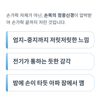 손가락이 아프다고 해서 꼭 손가락 자체의 문제는 아닐 수 있습니다. 손목을 통과하는 정중신경이 두꺼워진 인대에 눌리면서, 그 신경이 연결된 손가락 끝까지 저리고 아픈 증상이 나타나는 것입니다.