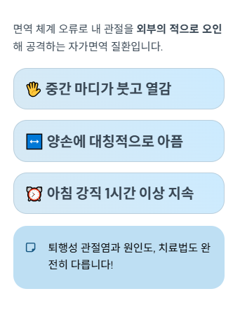 단순히 손을 많이 써서 닳아 아픈 것이 아닙니다. 우리 몸을 지켜야 할 면역 체계가 오류를 일으켜, 오히려 내 관절을 외부의 적으로 오인하고 공격하는 '자가면역 질환'입니다. 이 경우는 위의 퇴행성 관절염과는 원인도, 해결 방식도 완전히 다릅니다.