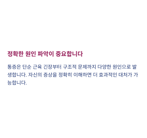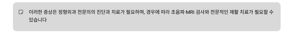 이러한 증상은 정형외과·물리치료 전문의의 진단과 치료를 필요로 하며, 경우에 따라 초음파·MRI 검사와 보다 전문적인 재활 치료가 필요할 수 있습니다.