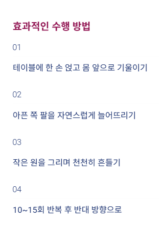 - 심한 통증·팔 움직임 제한·저림 증상이 있다면 전문적인 진단이 필요합니다.