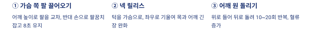 다음은 8초 이상 유지하고 반복하면 어깨 주변 근육의 즉각적인 긴장 완화에 도움이 되는 스트레칭입니다.