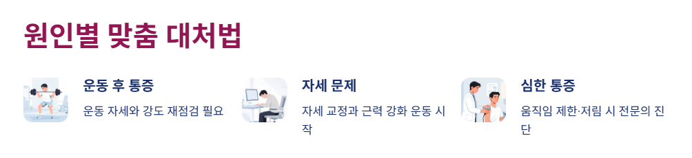 - 운동 후 통증이 계속된다면 운동 자세나 강도를 점검합니다.