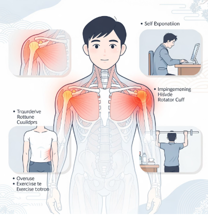 어깨 통증은 단순 근육 긴장부터 회전근개 손상, 점액낭염, 관절 문제, 관절 주변 염증, 자세 불균형 등 다양한 원인이 있습니다. 지속적인 통증이나 움직임 제한이 있다면 아래 사항을 고려하세요.