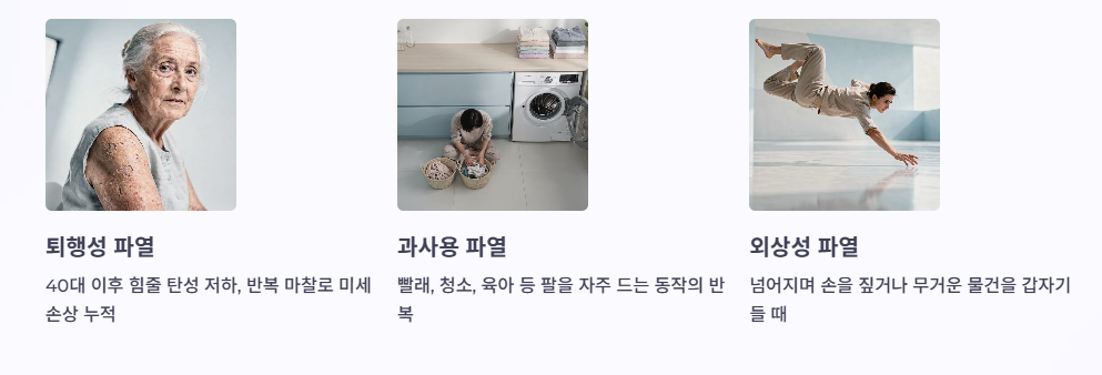 둘째, 과사용 파열입니다. 빨래 널기, 청소, 육아처럼 팔을 자주 들거나, 운동에서 어깨 동작을 무리하게 반복하면 염증→약화→파열로 진행하기 쉽습니다.