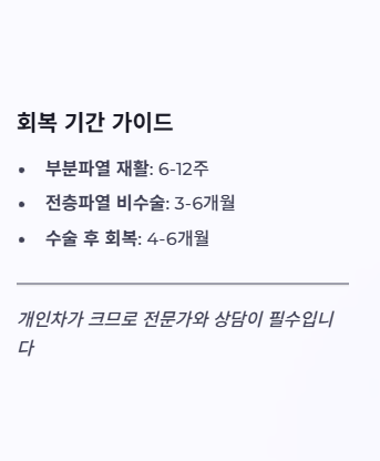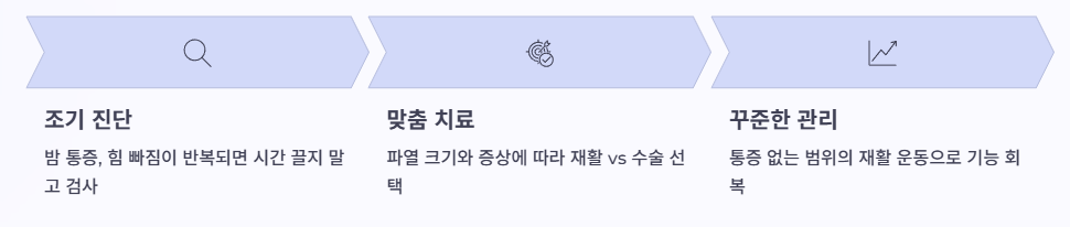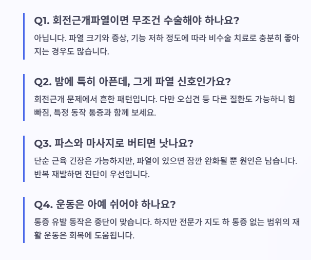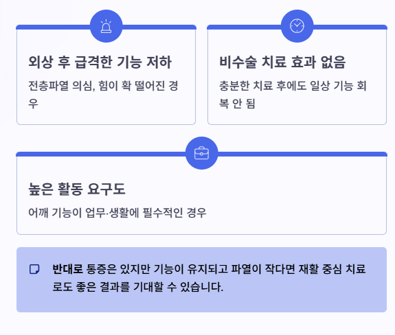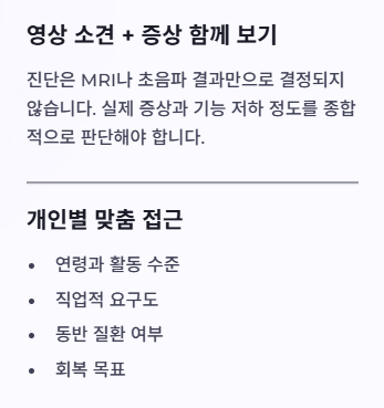 반대로 통증은 있지만 기능이 유지되고, 파열이 작거나 부분파열이라면 재활 중심으로도 좋은 결과가 나오는 경우가 많습니다.