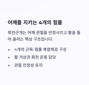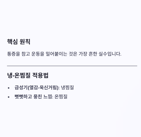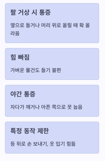 - 피할 것: 통증이 확 올라오는 범위에서 팔 반복 거상, 무거운 물건 머리 위로 들기