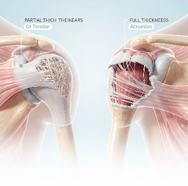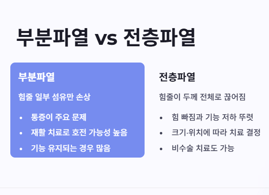 부분파열은 힘줄의 일부 섬유가 찢어진 상태라 통증이 주로 문제이고, 재활 치료로 호전되는 경우가 많습니다. 전층파열은 힘줄이 두께 전체로 끊어진 상태로, 힘이 빠지고 기능 저하가 더 뚜렷할 수 있습니다.