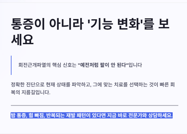 단, 오십견처럼 움직임 자체가 확 줄어드는 경우도 있지만, 초기에는 “아프지만 움직이긴 된다”가 많습니다. 그래서 더 방치하기 쉽습니다.