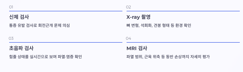 진료에서는 통증 유발 검사로 회전근개 문제를 의심하고, 필요하면 영상검사를 합니다.