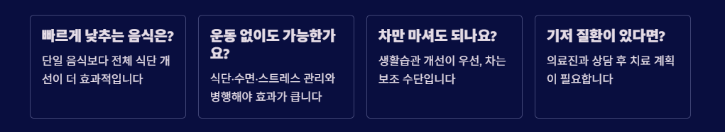 식단 전체와 생활습관 개선이 우선이며, 차나 보충제는 보조 수단으로 생각하는 것이 좋습니다.