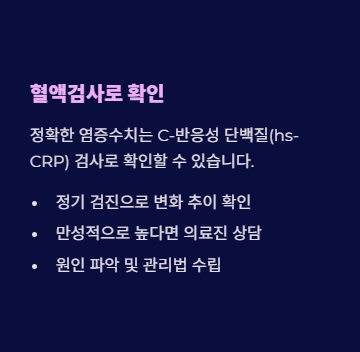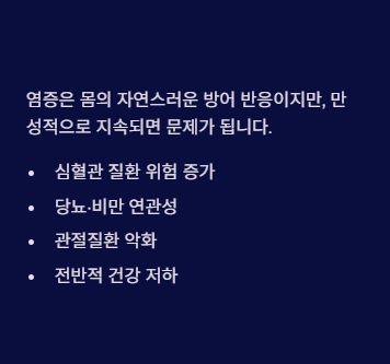 만성 염증은 심혈관 질환, 당뇨, 관절염 등과 연관되므로 염증수치 조절이 전반적인 건강 개선에 도움이 됩니다.