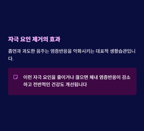 흡연과 과도한 음주는 염증반응을 악화시키는 대표적 생활습관입니다. 이런 자극 요인을 줄이거나 끊으면 체내 염증반응이 감소하고, 전반적인 건강도 개선됩니다.