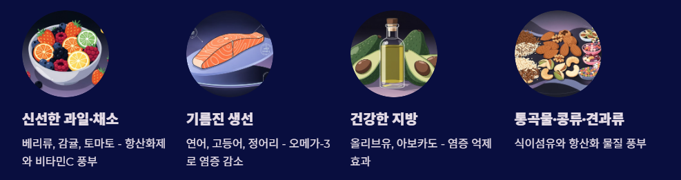 베리류, 감귤, 사과, 토마토 등은 항산화제와 비타민C가 풍부합니다. - 기름진 생선(오메가-3)