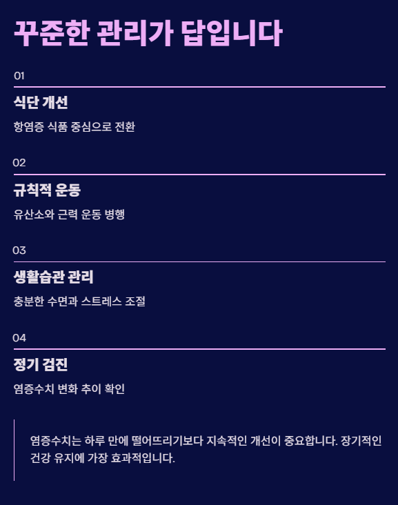 염증수치는 하루 만에 크게 떨어뜨리기보다는 식단과 생활습관을 지속적으로 개선하는 것이 중요합니다. 꾸준한 관리가 장기적인 건강 유지에 가장 효과적입니다.