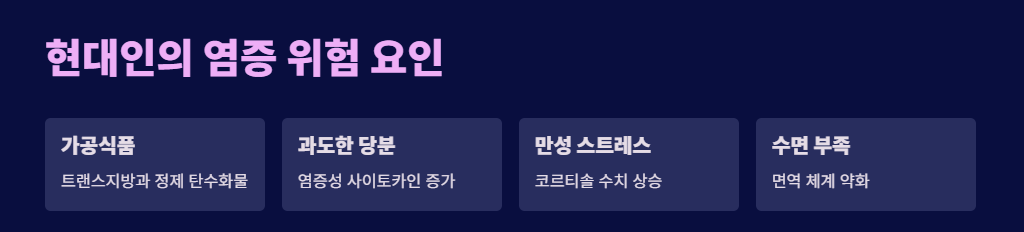염증은 우리 몸의 자연스러운 반응으로 부상·감염 치료에 필요하지만, 만성적으로 높게 지속되면 심혈관 질환, 당뇨, 비만, 관절질환 등 여러 질병 위험을 높입니다. 현대인은 가공식품·과도한 당분·스트레스·수면 부족 등으로 염증 위험이 커지는 경우가 많습니다. 다행히 생활 전반을 바꾸는 것만으로도 염증수치를 낮출 수 있는 방법들이 있습니다.