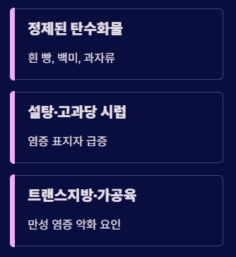 - 정제된 탄수화물(흰 빵·백미·과자)