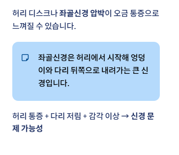 허리 통증과 함께 다리 저림이나 감각 이상이 있다면 신경 문제일 가능성이 큽니다.