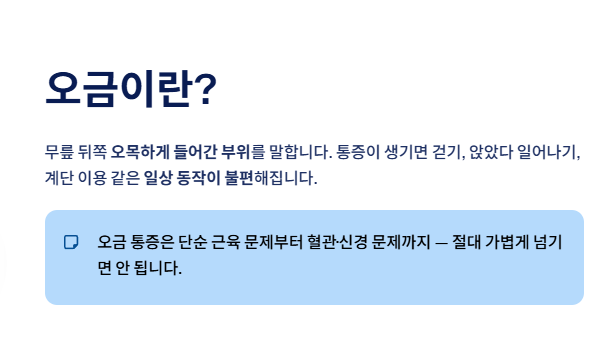 오금은 무릎 뒤쪽 오목하게 들어간 부위를 말합니다. 평소에는 크게 신경 쓰지 않는 부위지만, 통증이 생기면 걷기, 앉았다 일어나기, 계단 이용 같은 일상 동작이 불편해집니다. 오금 통증은 단순 근육 문제일 수도 있지만, 무릎 관절 질환이나 혈관·신경 문제와 연결되는 경우도 있어 가볍게 넘겨서는 안 됩니다. 특히 통증의 양상과 동반 증상에 따라 원인이 크게 달라질 수 있습니다.