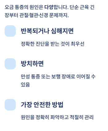 오금 통증은 단순 근육 긴장부터 관절·혈관·신경 문제까지 원인이 다양합니다. 통증이 반복되거나 점점 심해진다면 방치하지 말고 정확한 진단을 받는 것이 중요합니다. 무릎 뒤 통증을 가볍게 넘기면 만성 통증이나 보행 장애로 이어질 수 있습니다. 원인을 정확히 파악하고 적절히 관리하는 것이 가장 안전한 방법입니다.