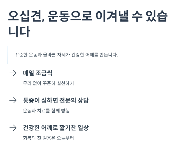 오십견은 일상 생활에 큰 불편을 초래할 수 있는 질환이지만, 적절한 운동을 통해 증상을 완화하고, 회복할 수 있습니다. 위에서 소개한 운동들은 어깨의 유연성을 높이고, 통증을 줄이며, 어깨의 가동 범위를 회복하는 데 효과적입니다. 중요한 점은 운동을 꾸준히 실천하는 것입니다. 운동을 통해 어깨를 강화하고 유연성을 높이면, 오십견을 예방하거나 치료할 수 있습니다. 만약 오십견 증상이 나타나면, 운동과 함께 전문적인 치료를 병행하는 것이 가장 좋은 방법입니다. 꾸준한 운동과 올바른 자세를 유지하여 건강한 어깨를 지키세요.