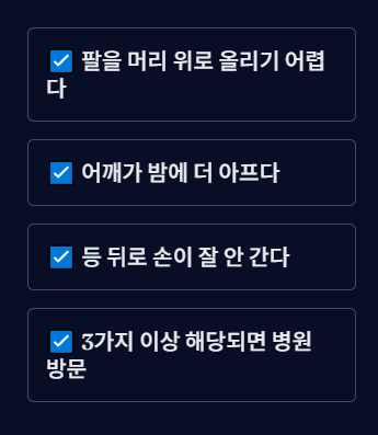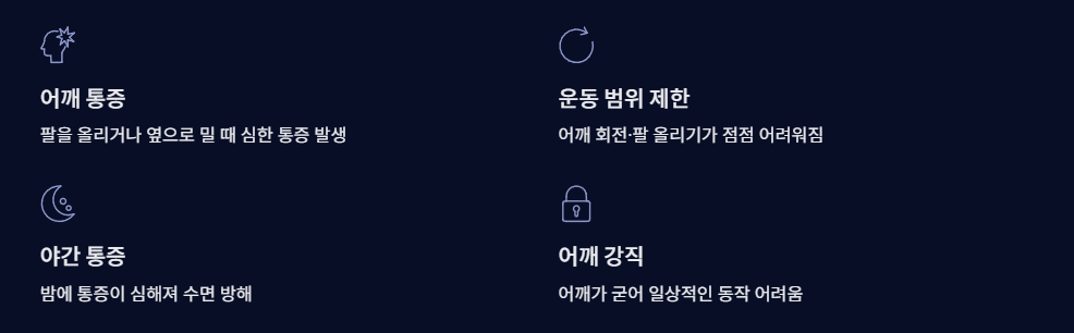 - 강직: 어깨가 굳어져 일상적인 동작을 하는데 어려움을 겪습니다.