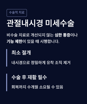 비수술적 치료에도 불구하고 증상이 개선되지 않는 경우, 수술을 고려할 수 있습니다. 수술은 대개 심한 통증이 지속되거나, 어깨 기능이 크게 제한된 경우에 시행됩니다. 수술 방법은 관절내시경을 이용한 미세 수술이 일반적입니다. 수술 후에는 재활치료가 필수적이며, 시간이 오래 걸릴 수 있습니다.