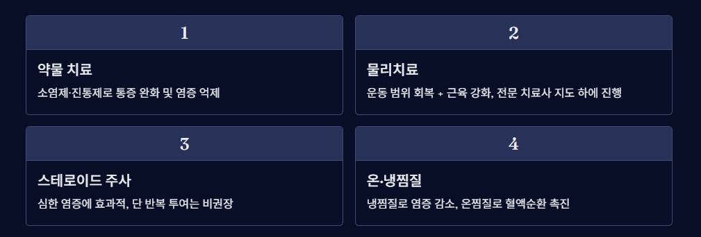 - 약물 치료: 염증을 줄이고, 통증을 완화하는 약물(소염제나 진통제)을 복용합니다. 이러한 약물은 증상을 완화하는 데 도움이 됩니다.