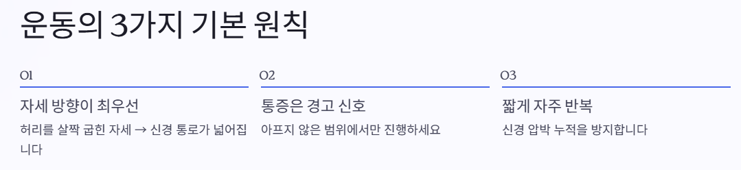 👉 허리를 부드럽게 굽혀 신경 공간을 확보하는 동작은 증상을 완화합니다.