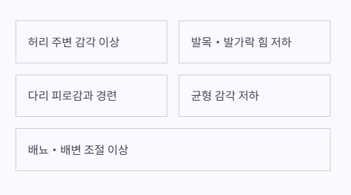 - 일부 환자는 다리 감각이 둔해졌다고 호소하거나 다리 힘이 떨어져 보행이 불안정해지는 경우도 있습니다.
