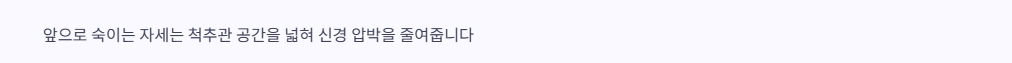 앞으로 굽히는 자세는 요추 척추관의 공간을 상대적으로 더 넓히기 때문에 신경 압박이 줄고 증상이 완화됩니다.