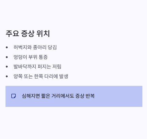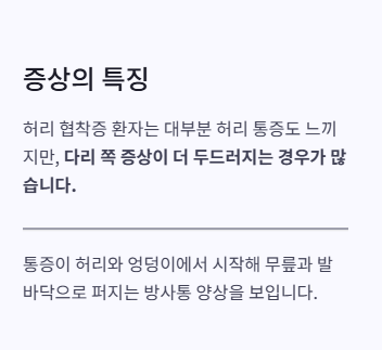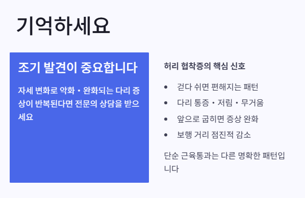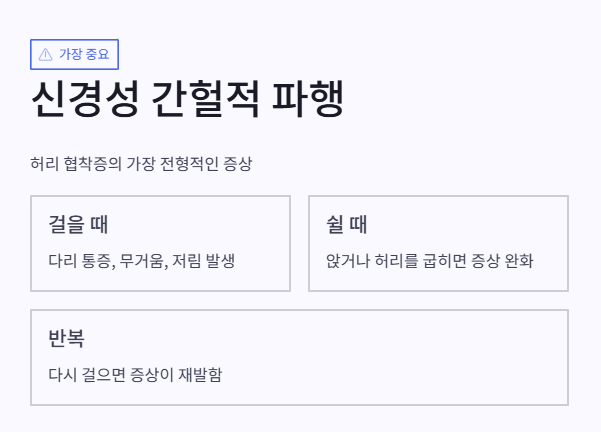 - 허벅지·종아리·엉덩이까지 당기고 저린 통증이 생기고, 걷다 멈춰서 앉거나 앞으로 허리를 굽히면 완화됩니다.