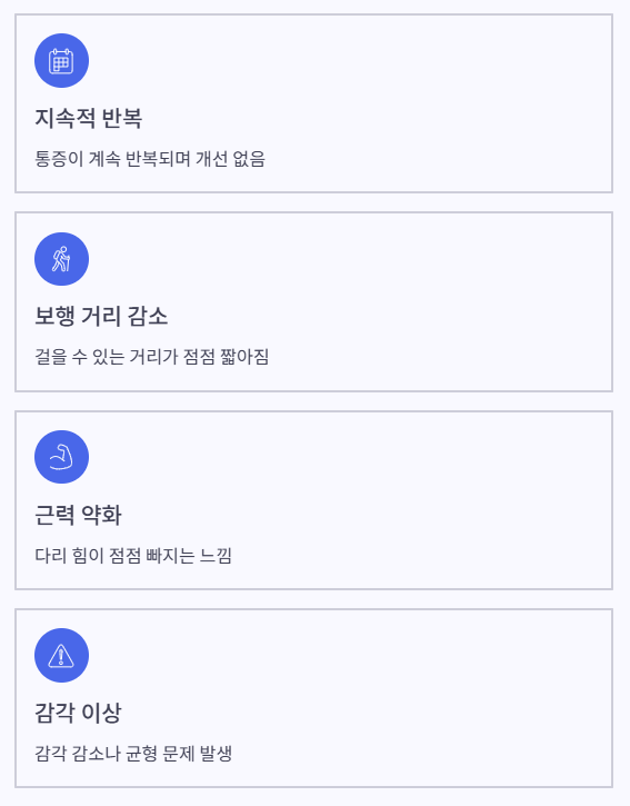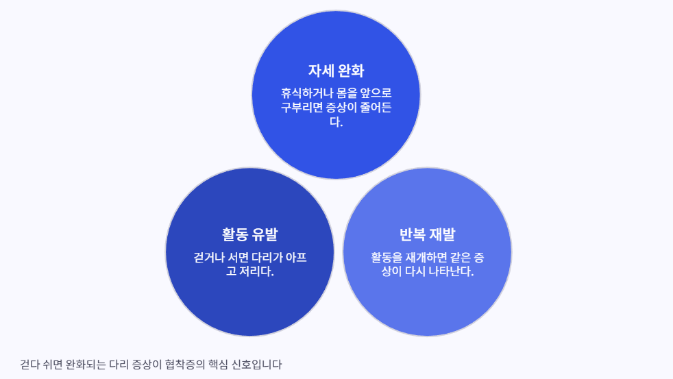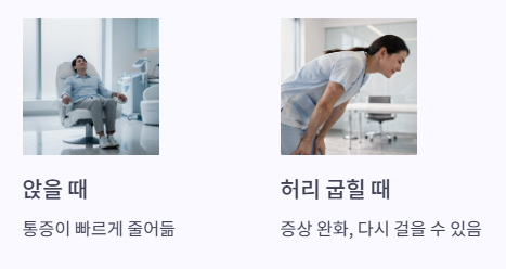 - 걷거나 서 있을 때: 다리 통증·저림·무거움이 심해지는 경향