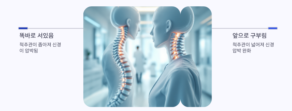 - 이런 자세 변화에서 증상이 좋아지는 이유는 앞으로 숙일 때 척추관이 상대적으로 넓어져 신경 압박이 줄어들기 때문입니다.