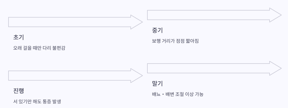 또한 요추관 협착증이 말기까지 진행되면 신경 압박으로 인해 배뇨·배변 조절에 이상이 나타날 수 있으므로 이러한 변화가 있으면 반드시 의료진 상담이 필요합니다.