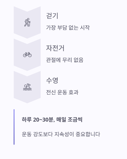 걷기, 자전거 타기, 수영처럼 부담이 적은 운동을 하루 20~30분 정도 꾸준히 실천하는 것이 도움이 됩니다. 중요한 것은 운동 강도가 아니라 지속성입니다.