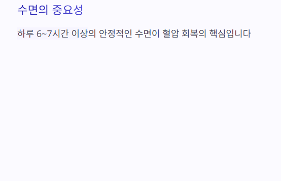 충분한 수면은 혈압 회복에 필수적입니다. 수면 부족은 혈압이 내려갈 시간을 빼앗는 요인입니다. 불규칙한 수면 습관은 혈압 조절 호르몬의 균형을 무너뜨립니다.