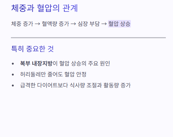 특히 복부에 쌓인 내장지방은 혈압 상승의 주요 원인입니다. 체중 변화가 크지 않더라도 허리둘레가 줄어들면 혈압이 함께 안정되는 경우가 많습니다.