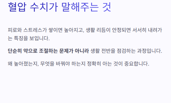 혈압 수치는 몸 상태를 가장 솔직하게 보여주는 지표입니다. 피로가 누적되거나 스트레스가 많아지면 높아지고, 생활 리듬이 안정되면 서서히 내려가는 특징을 보입니다. 그래서 혈압 관리는 단순히 약으로 수치를 조절하는 문제가 아니라 생활 전반을 점검하는 과정에 가깝습니다.