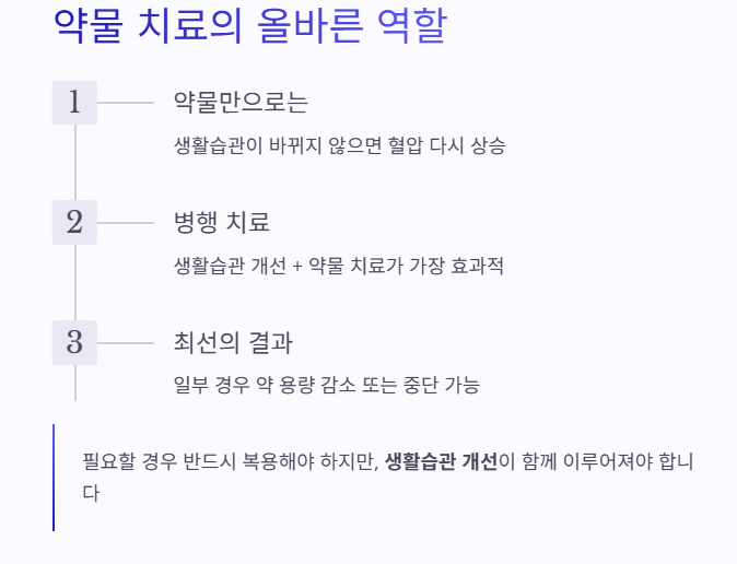 생활습관 개선과 약물 치료를 병행했을 때 가장 안정적인 혈압 관리가 가능합니다. 일부 경우에는 생활습관 개선을 통해 약 용량을 줄이거나 중단하기도 합니다.