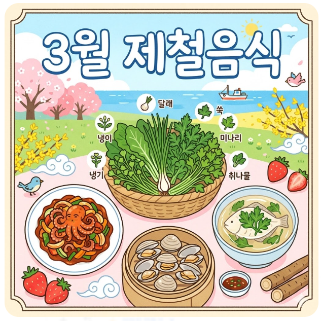 3월 제철음식 종류와 효능을 한눈에 정리했습니다. 달래, 냉이, 주꾸미, 바지락 등 봄철 건강을 지키는 식재료와 맛있게 먹는 방법까지 확인하세요.