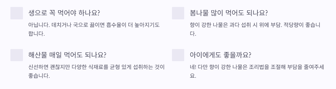 향이 강한 나물은 과다 섭취 시 위에 부담이 될 수 있습니다. 적당량이 좋습니다.